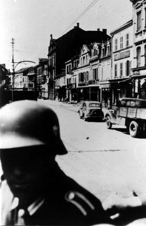 Patrouille allemande dans la rue Nationale, a droite la vieille Place du Marché (Place Garcia)